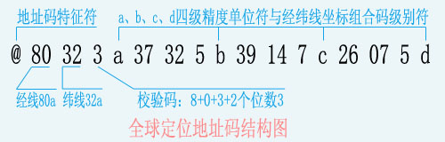 全球定位地址码简要规则原创:宁振云 2003年 1、经线码值:分a、b、c、d四级。a级:以东经180度(日期变更线)为零点,向东绕地球一圈96等分(取4倍于24小时,便于计算时差),每1等分称“1a”;b级:每1a再分100等分,每1等分称“1b”;c级:每1b再分100等分,每1等分称“1c”;d级:每1c再分100等分,每1等分称“1d”。每一级码值不够两位的,用“0”补,从而构成经线码值。 换算关系: 1°=[96/360]a 1′=[96/(360×60)]a 1″=[96/(360×60×60)]a 1a=100b,1b=100c,1c=100d。 2、纬线码值:从南纬90度起到北纬90度48等分,其它精度级别的等分方法与经线码值相同。 3、数值编码:以“@+2位经线a值+2位纬线a值+1位校验码(为前面4位数值之和的个位数)+a+……”为模式构成a、b、c、d四级经纬线坐标所组合的全球定位地址码,以此由大到小逐级定位全球的任何地点。 例如:上海某公司在东经121°24′08″,北纬31°12′19″,按规则换算为: (180+121+24/60+8/(60×60))×96/360≈80.373926,其经线码值:80a 37b 39c 26d ( 90+31+12/60+19/(60×60))×48/180≈32.321407,其纬线码值:32a 32b 14c 07d 其全球定位地址码即为:@80323a 37325b 39147c 26075d。其全球定位地址码结构如图所示:
