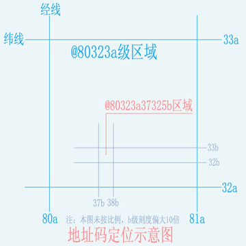 4、加标高度编码:如果需要,可加标“海拔高度(米)+h”。如:@80323a 37325b 39147c 26075d 168h为海拔高168米;@80323a 37325b 39147c 26075d -6.5h为低于基准海平面6.5米。 按WGS-84 GPS基准椭球的赤道半径a=6378137m计算, 则W纬线上的各级精度区域至少不大于: a级:418 公里×418 公里 Sin(W×180/48) b级:4.18公里×4.18公里 Sin(W×180/48) c级:41.8 米 ×41.8 米 Sin(W×180/48) d级:41.8厘米×41.8厘米 Sin(W×180/48) 因单位经线码值的间隔距离是随着纬线偏离赤道(W=24)越大而变小,精度区域也是如此,但单位纬线码值的间隔距离则基本保持不变。